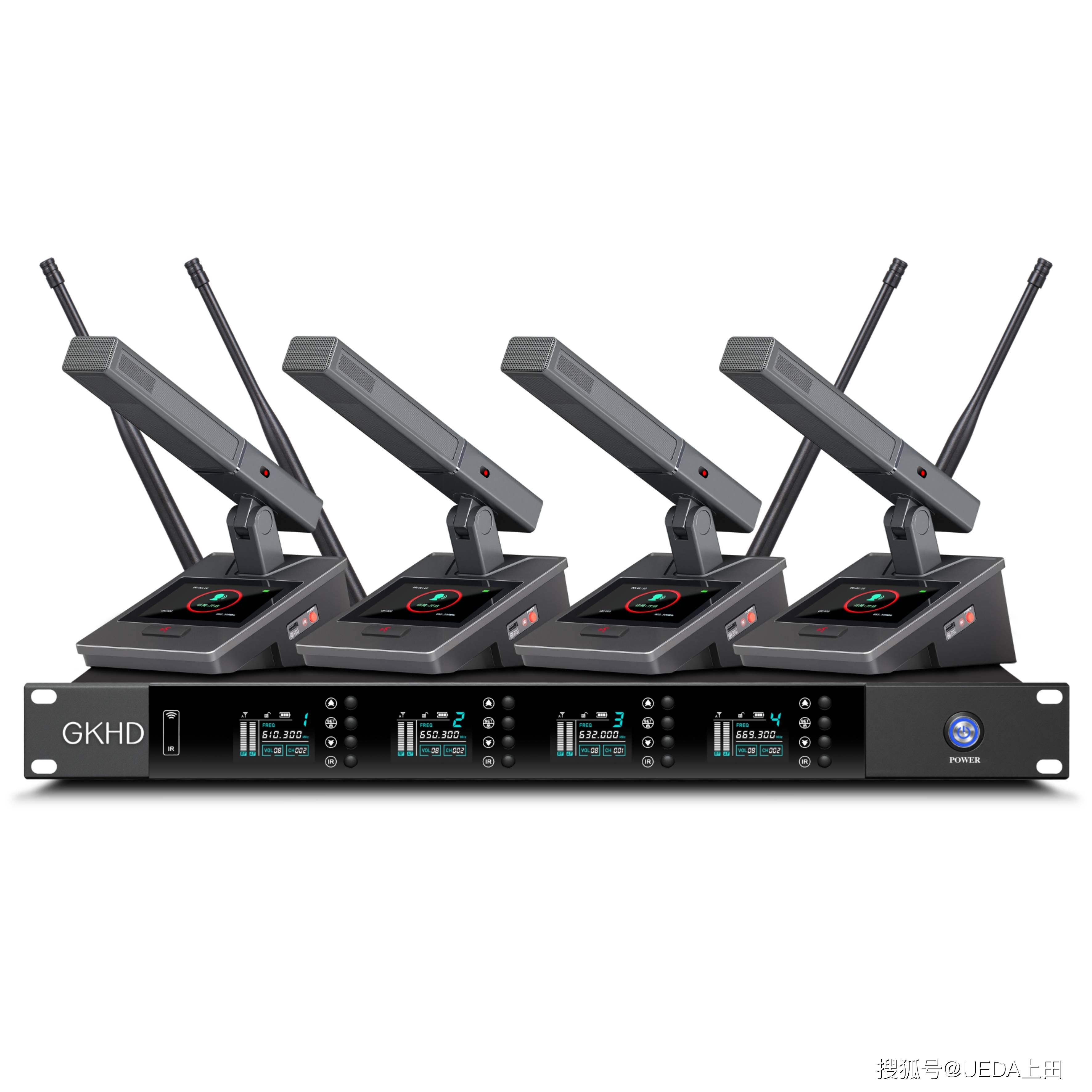 4.★一键自动搜频,智能数字信号场强FI检测,定点监控使用中的频率状况 5.主机自带锁键功能 6.PLL锁相环频率合成技术动态音频压缩及自动电平控制电路7.杂讯锁定静噪控制+音码导航锁定静噪控8.★金属面板 3.5寸大屏 双咪芯 配充电线.充电电池.充电头,通过充电器直接给单元充电,电池可拆卸,可使用3节5号电池供电9.★提供国家认证第三方带“CMA”“CNAS”标识检测报告,扫码可查。10.一键静音/开启语音功能主机参数:主机工作电压:DC--12V工作电流:1000mA功耗:12W射频载波范围: 632.00-698.70MHZ频率响应:80HZ -15KHz (±3db)动态范围:> 110db系统失真/总谐波失真THD:< 0.5%信噪比:S/N> 100db(A)射频灵敏度: -100dbm for 30db S/N Ratio镜像抑制:> 75db电源要求: 12V/1A接收灵敏度:-105dBM分集接收失真度THD:<0.01% 音频输出电压:0.3V邻频干扰抑制:>60dB会议话筒参数:拾音器类型:电容/柱极体咪芯指向性:超心形指向拾音灵敏度:>-20dBM(1V)发射功率:>+10dBM(10mWH)接收距离:空旷距离100-200米音频响应:100HZ—18KHZ频率稳定度:+-0.001% 增益:10db输入阻抗:5KΩ射频输出功率:30mW副波抑制:> 50db电源要求:1.5V*3(AA)或2000mAh锂电池/3.7V频率稳定度:±0.002%FM最大调制频率偏: ±45KHz
