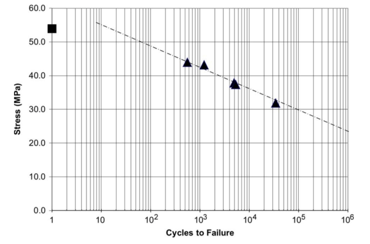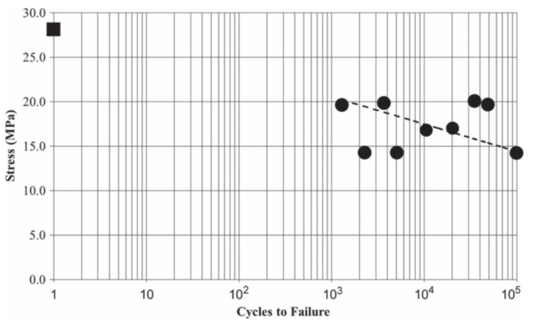 图5:带一体化铜片的CTD-425/S-2玻璃复合材料在80摄氏度下的短梁剪切疲劳数据。平均静态剪切强度值以方形符号标示,疲劳测试结果以三角形符号标示。虚线表示疲劳趋势线的线性外推。