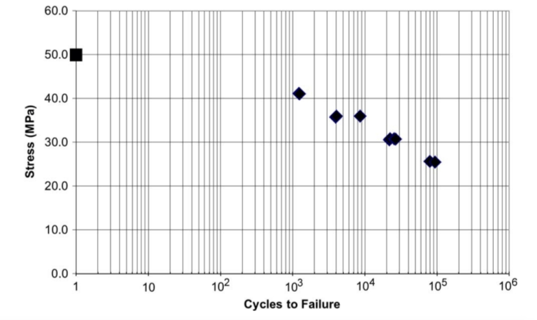 图4:带一体化铜片的CTD-425/S-2玻璃复合材料在100摄氏度下的短梁剪切疲劳数据。平均静态剪切强度值以方形符号标示,疲劳测试结果以菱形符号标示。