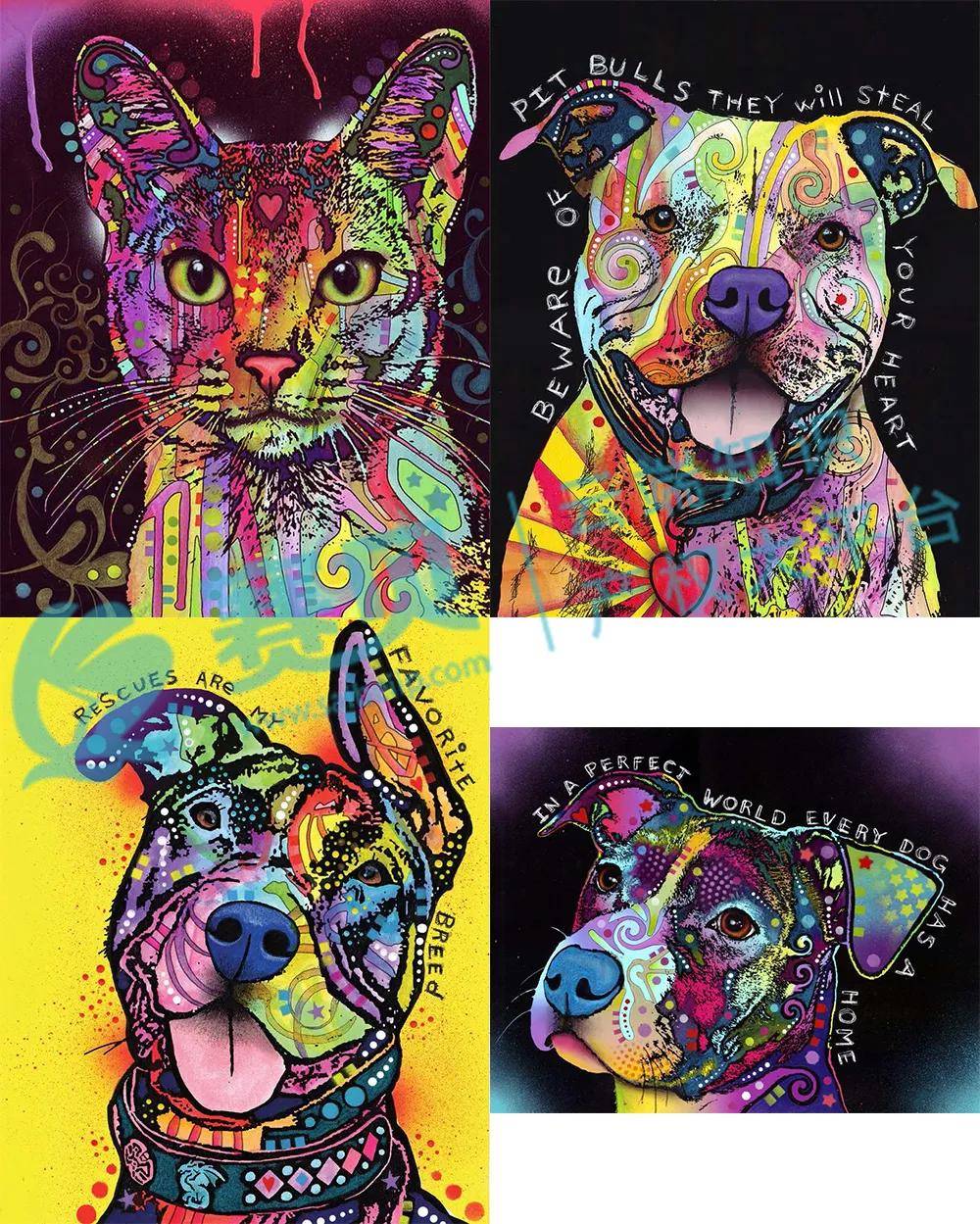 艺术家Dean Russo在动物主题艺术领域名气不小。从小就接触艺术,后来在视觉艺术学院和普拉特研究所系统学习平面设计与美术,早期主要画名人肖像,直到受自家两只可卡犬启发,才把创作重心转向动物主题,其中比特犬相关作品占比最高。他的艺术风格特别好认,是典型的 “波普艺术+街头涂鸦” 融合风 —— 用高饱和度的撞色,搭配螺旋纹、波点、星星等密集装饰图案,再以黑色粗线条勾勒动物轮廓,视觉冲击力极强,还常嵌入与动物保护相关的文字,让作品既有潮流感又有公益属性,在欧美市场认可度很高。