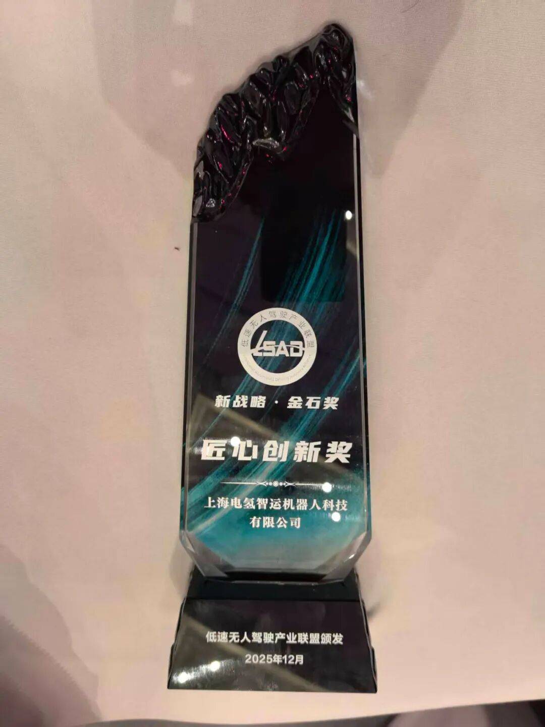 2025年12月19日,在武汉举行的 “2025低速无人驾驶行业发展年会” 上,上海电氢智运机器人科技有限公司 凭借其创新产品 “无人驾驶运载机器人”,荣获行业权威奖项——“新战略·金石奖—年度匠心创新奖”。