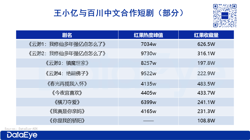 在所有合作版权方中,王小亿与百川中文的合作最为紧密。据不完全统计,双方已合作了9部作品,涵盖《云渺》系列、《春光再揽我入怀》、《今夜宜喜欢》、《横刀夺爱》、《我真是你亲妈》、《你是我的骄阳》等多部爆款短剧。