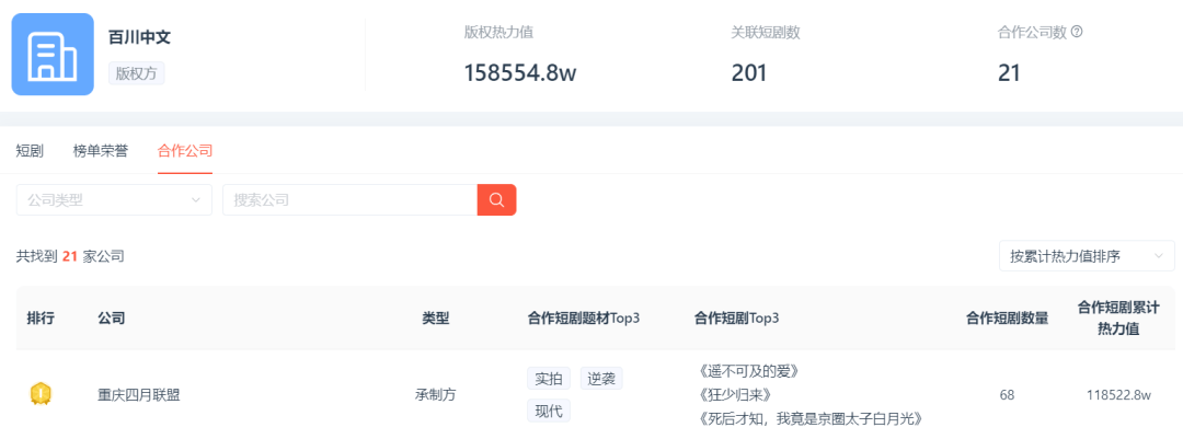 根据DataEye剧查查小程序,百川中文累计上线作品超200部,总热力值达15.9亿,位居行业版权方热力值前列。