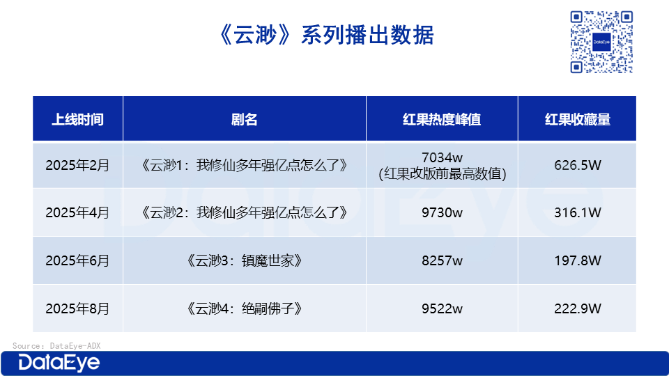 该系列不仅助力演员个人发展,更开创了短剧IP系列化的先河。《云渺》系列上线不足一年便连续推出四部作品,热度持续攀升,四部作品的热度峰值均突破7000万,实现热度与口碑的双延续。