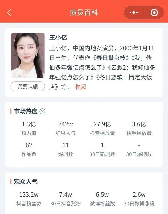 DataEye剧查查小程序数据显示,王小亿累计参演短剧62部,其中爆剧超10部,关联作品累计热力值1.3亿、抖音播放量27.9亿、快手播放量3.6亿,是业内公认的“短剧女王”。