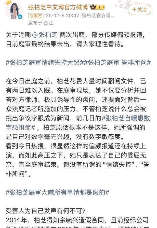 最近,张柏芝陷入了与前经纪人余毓兴的法律纠纷,媒体对此事的报道持续更新。12月8日晚上,张柏芝通过社交平台发布了一则动态,回应了庭审过程中的一些情况。