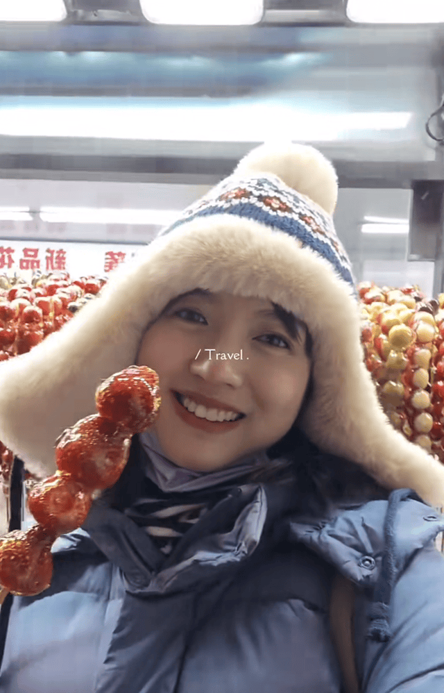 话说回来,到哈尔滨度假的张梓琳还打卡了中央大街,吃了各种美食。下图中拿着糖葫芦拍照的张梓琳,鼻头都被冻得有些红了,但相比美食,这些并不算什么,张梓琳自己都说:“别问我冷不冷,问就是好吃。”