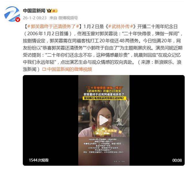 2026年1月2日凌晨,刚刚过去的新年钟声尚未完全散去,网友们却因另一个纪念日而热议纷纷。这一天不仅是古装喜剧《武林外传》开播二十周年的日子,还因为剧中的一个神奇剧情设定成为现实,引发了全网的关注——剧中那个既莽撞又侠义的雌雄双煞郭芙蓉,经过在同福客栈工作整整二十年,终于还清了48两银子的债务,成功获得了自由。