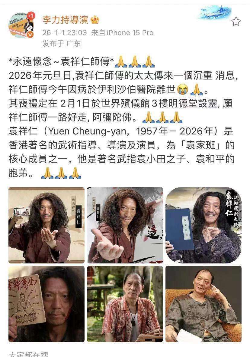 导演李力持在元旦第一天发文悼念袁祥仁。李力持在文章中写道,元旦当天,他接到袁祥仁师傅的妻子传来的噩耗,得知袁祥仁于2026年元旦中午去世。根据安排,袁祥仁的丧礼将于2月1日,在世界殡仪馆三楼的明德堂举行。李力持表示,希望袁祥仁师傅一路走好。