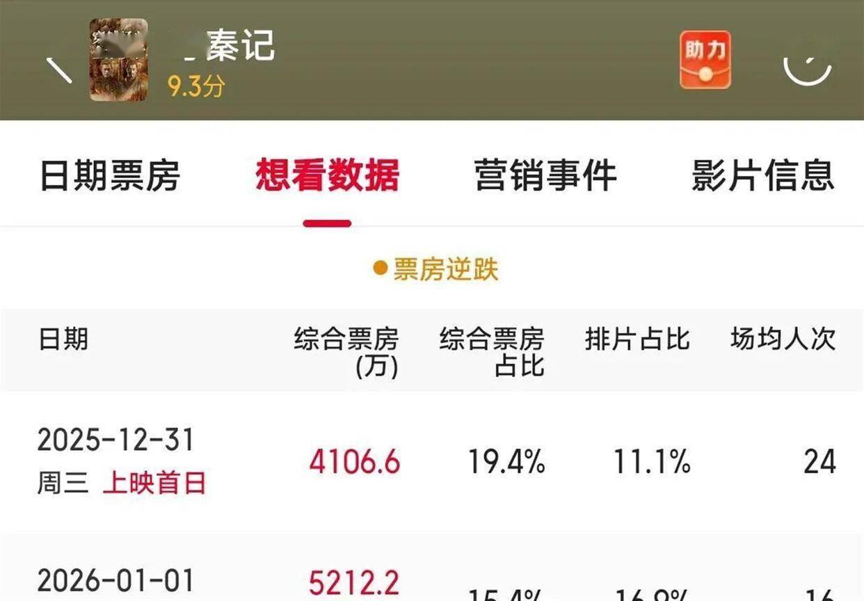 上映首日,《寻秦记》票房仅4106万,排在元旦档单日票房第四名,甚至打不过已经上映一个月的《疯狂动物城2》。 业内预测这部情怀电影的总票房可能只有1.94亿。