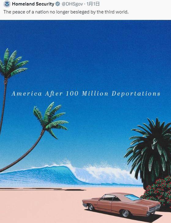 配图是一张汽车停在沙滩边的插画,画面风格清爽、复古,充满上世纪美式度假氛围。而画面上,却赫然写着一行大字:“驱逐100万人后的美国”
