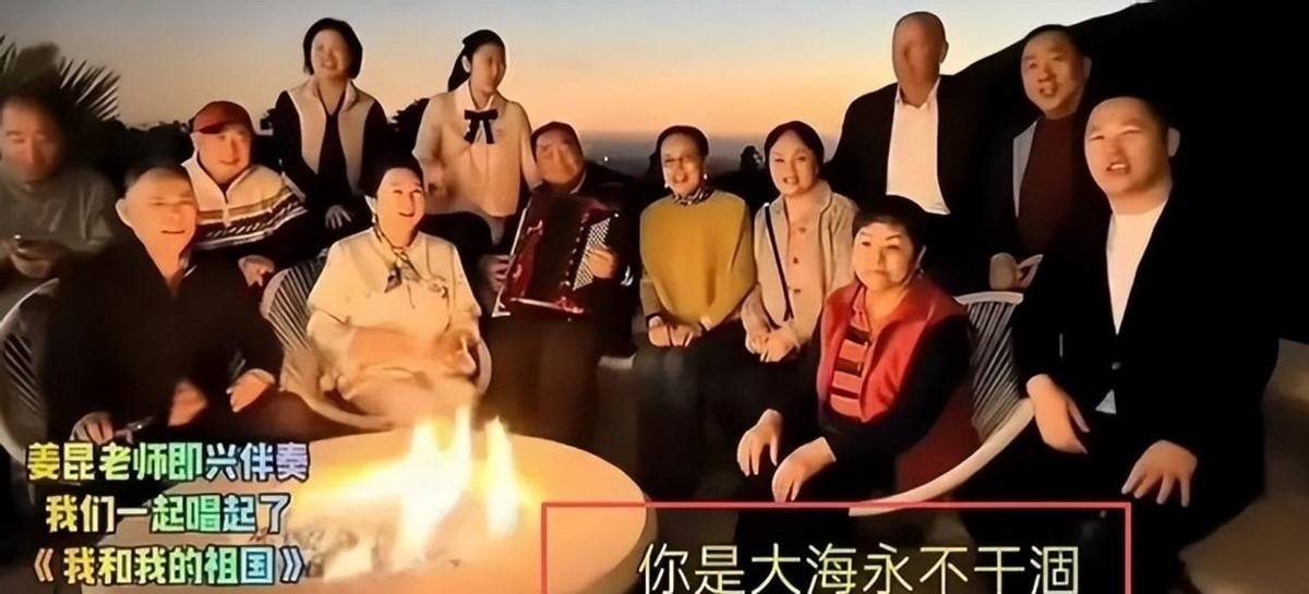 视频里十多个人围着篝火,姜昆坐C位拉手风琴,唱的是《我和我的祖国》。背景是国外的圣诞树,日子还是圣诞节。这混搭风,评论区直接吵翻了。