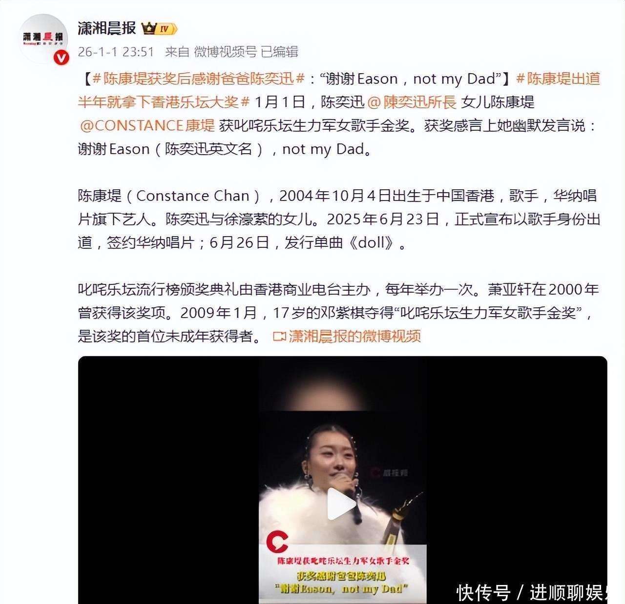 陈康堤的获奖之速也创造了另一项纪录:从2025年6月23日正式签约华纳唱片并宣布出道,到发行首支单曲《doll》,再到2026年1月1日捧起金奖,这一切的过程仅仅用了半年时间。这种如火箭般的上升速度,几乎让人无法忽视她作为陈奕迅女儿所带来的巨大光环。正因如此,她在颁奖礼上那句谢谢Eason,not my Dad,更显得深意十足。她不仅感谢的是作为乐坛标杆的父亲陈奕迅,同时也在向大家宣告:我站在这里,是以歌手陈康堤的身份,而不是陈奕迅的女儿。对于星二代而言,娱乐圈的路注定不会平坦——资源和质疑常常是并行而至的。观众的眼光一向十分犀利,他们会判断你是否真的具备实力,还是单纯依赖父辈的影响力。陈康堤的聪明之处在于,她并没有回避自己的家庭背景,反而勇敢地站在台上,用自己的话语权界定了这场对话的出发点——先承认那束光的存在,再通过自己的努力去证明自己也能独当一面。