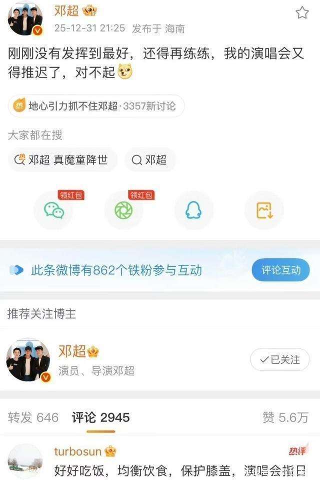 2025年12月31日的跨年夜,海南海口五源河体育场的舞台上,邓超的演出结束后,他发布了一条微博,自评表演未尽如人意,瞬间引发了网友的广泛关注。与此同时,远在江苏的孙俪也在微博评论区留言,关心丈夫的健康,提醒他注意膝盖保护。两人隔空的互动,瞬间甜化了无数网友的心,被大家亲切地称作真夫妻的糖最好嗑。这看似平常的夫妻日常,却让邓超和孙俪的模范夫妻形象更加深入人心,成为跨年夜的一道温暖风景线。