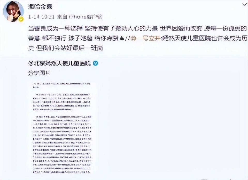 而海哈金喜呢?不是她创办的医院,不是她的孩子,却是她转发、力挺、点赞的理由。