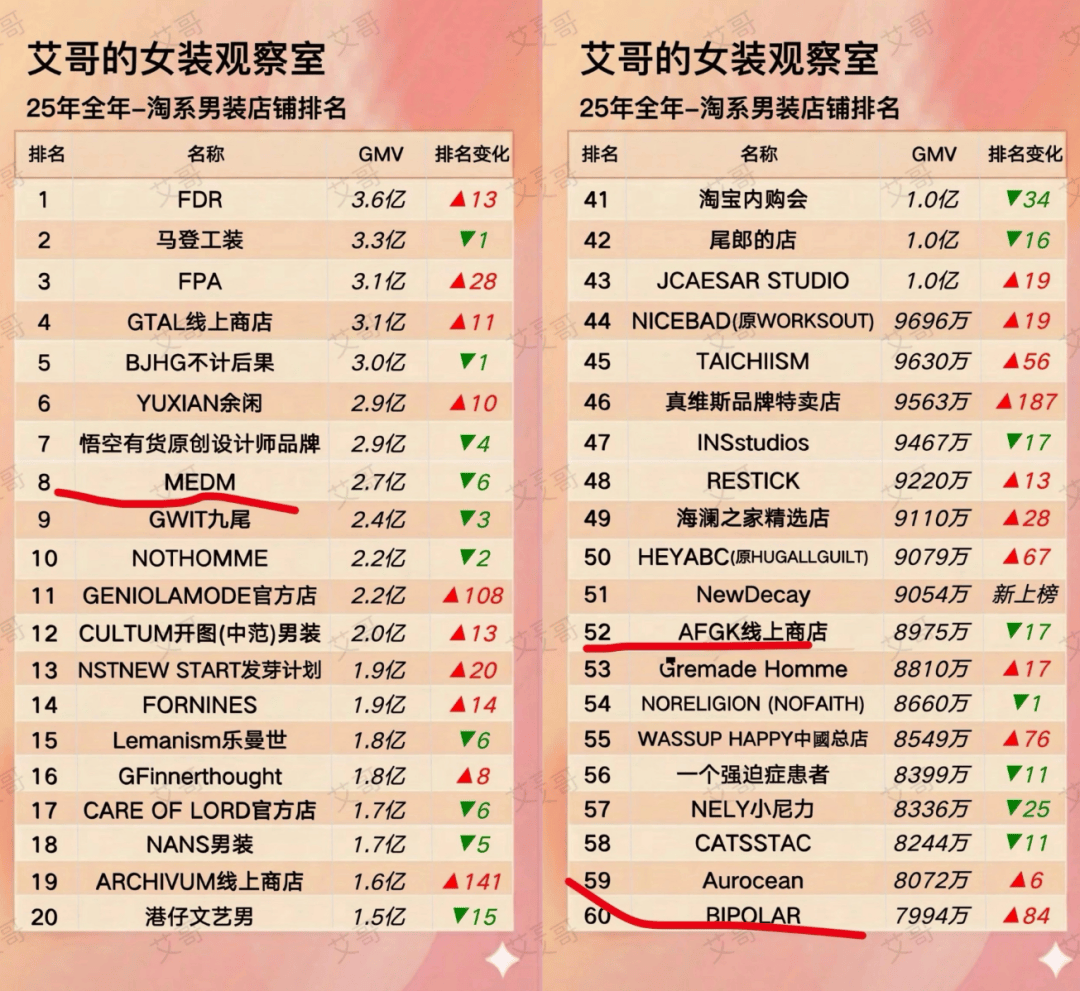 就在最近,有博主(艾哥的女装观察室)统计了淘系男装2025的GMV销售额TOP100,前100中,一共有3位Rapper的牌子: