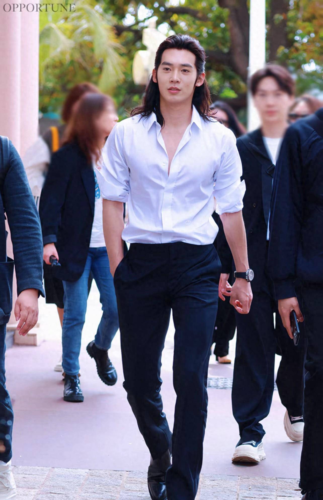 最让人眼前一亮的是他的发型:大背头!内娱男星清一色逗号刘海看腻了,他倒好,头发全往后梳,发量浓密得让人怀疑人生。灯光下一照,额头锃亮却不油腻,发胶打得刚刚好,利落又不刻意,反而透出一股随性的洒脱劲儿。