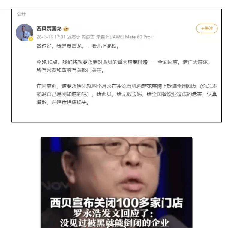 这事儿说起来离谱又好笑。1月16号贾国龙放狠话,晚上直播要罗永浩给西贝道歉、给宝妈道歉,还甩锅说罗永浩误导消费者,导致宝妈不带孩子吃西贝营养餐,甚至关店102家都要罗永浩赔偿。结果呢?直播间刚开没几分钟,他和罗永浩双双被封,掐架都没掐成,沦为全网笑柄。