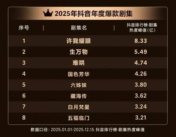 2025年抖音年度爆款剧集榜单正式揭晓,数据显示,《许我耀眼》以8.33亿的热度峰值断层领跑。