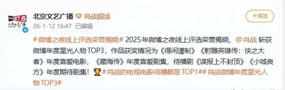 2026年初,34岁的肖战迎来了人生中的双喜临门。在2025年微博之夜的舞台上,他不仅凭借一己之力斩获了微博年度星光人物奖项,还凭借主演的多部作品,获得了年度最喜爱或最期待的荣誉。这一切的成绩来得异常迅速,回望过去,他仅仅凭借《陈情令》爆红后,被贴上了流量花瓶的标签,而如今,这一切似乎已经远离了他。短短几年之间,肖战从一名流量偶像,逐渐蜕变成了受人尊重的演员。