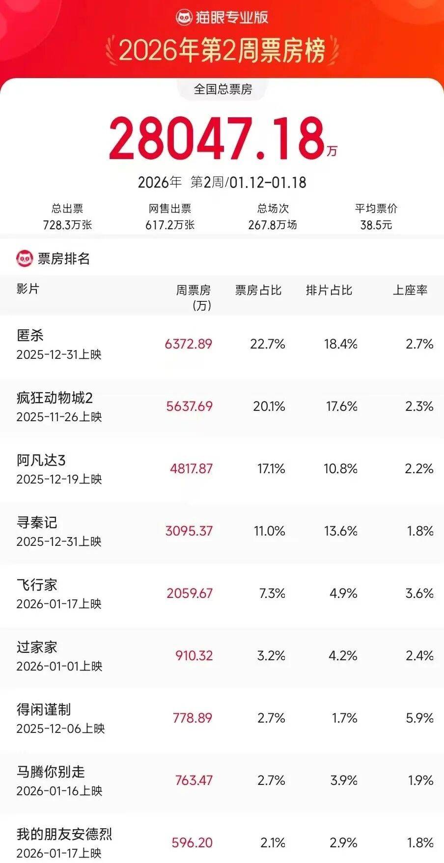 旧片中,《匿杀》第三周报收6372万蝉联周冠,目前累计票房已破3.6亿,最终有望冲击4.5亿。