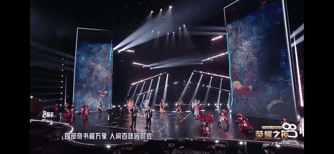 贾雨檬等主播热血说书,搭配华丽舞台呈现 ——《红楼梦》借助皮影画舞美,用喊麦唱出了家族的兴衰沉浮;《水浒传》舞台豪情激荡,尽显江湖英雄的肝胆豪情;戏剧演员生动衔接《三国演义》,重现沙场权谋与征战风云;最后,用一群“孙悟空”挥动金箍棒收束《西游记》。结尾以AI作词的“四部奇书藏万象,人间百味皆可尝”点睛,整场表演层层递进、异彩纷呈。