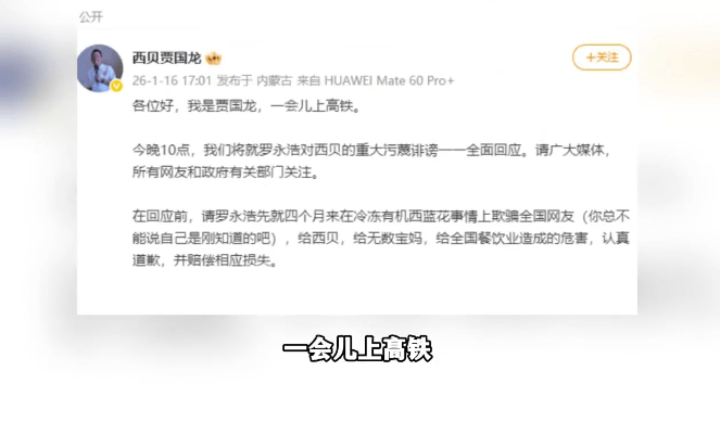 西贝的贾国龙突然在微博上发声表示要对罗永浩对西贝的重大污蔑诽谤一一进行全面回应,似乎又要挑起双方的战火。虽然结果两人的微博都遭禁言,但贾国龙还是忿意难平,通过西贝小号发文声称罗永浩污蔑政府、污蔑司法,上纲上线,还带上了某种暗示……