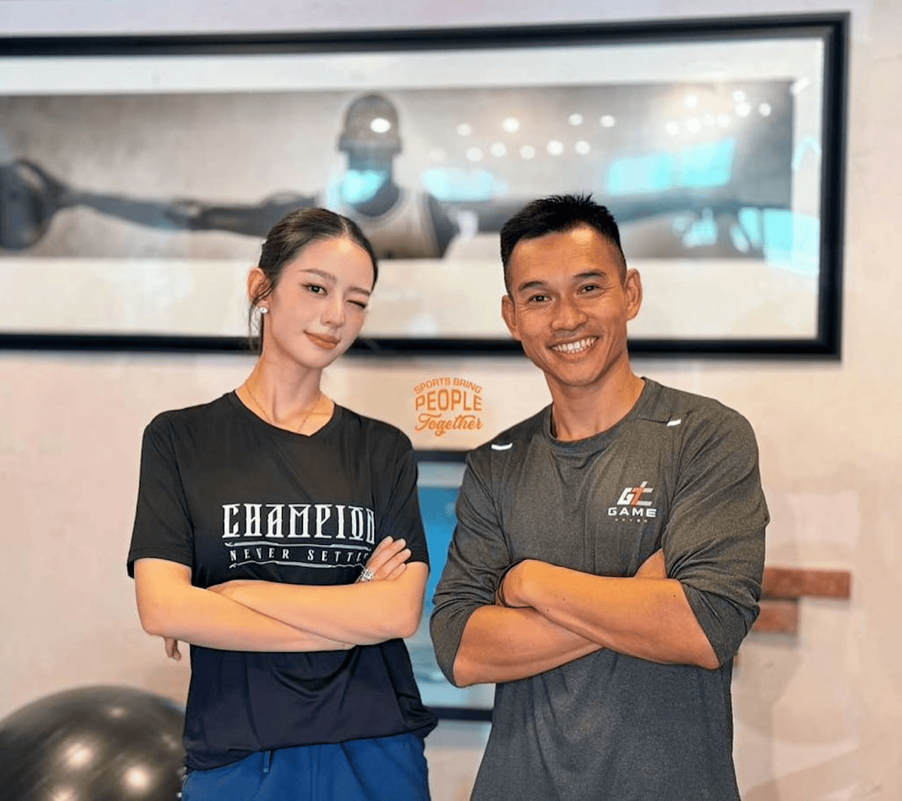 两人的相识挺简单。2025年初,阿Sa因为拍戏强度大,身体肌肉劳损,好友关智斌就把自己的私教林俊贤推荐给了她。一开始就是教练和学员的关系,林俊贤专业又耐心,会根据她的情况定制训练和饮食计划。相处久了,阿Sa发现这个比自己小十岁的男生,有种特别的沉稳和细心。