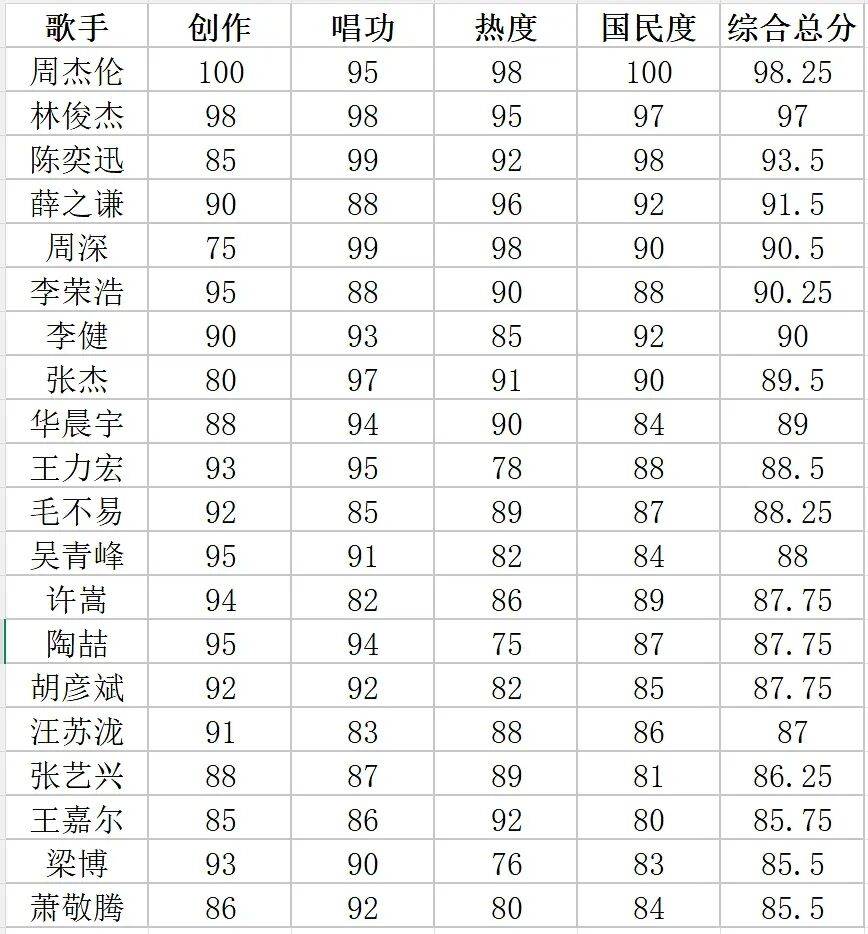 周杰伦以98.25的综合高分傲视群雄,他在创作(100分)和国民度(100分)上的满分表现,印证了他作为一个时代符号的不可撼动性。