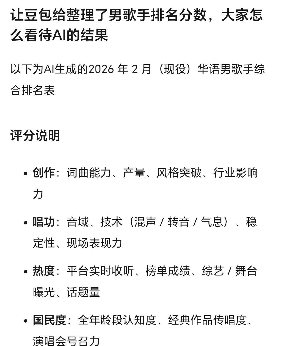 这一次,是有网友让豆包对华语乐坛进行了排名,大家就当看乐子就行,客不客观反正是不知道,肯定比网友客观。