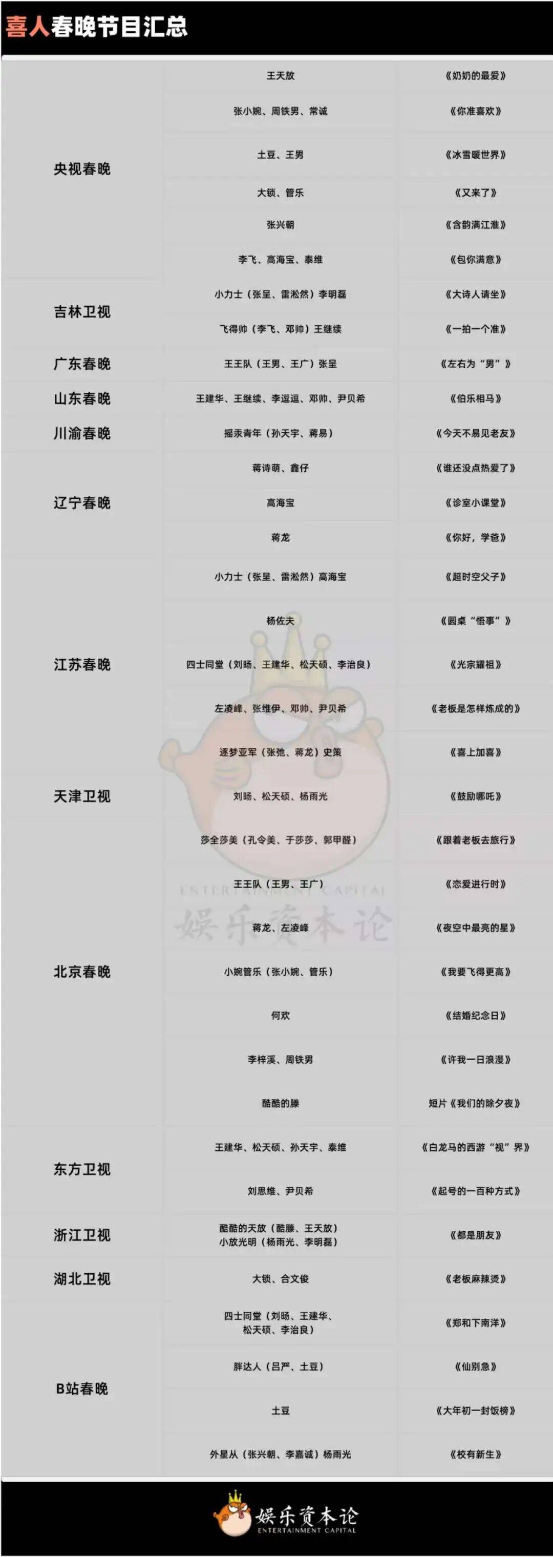除了央视外,11个主流卫视的春晚都有喜人的节目出现。甚至江苏卫视一下子就请来了张呈、雷淞然等11位喜人演员出演,仿佛一场“喜人年会现场”。