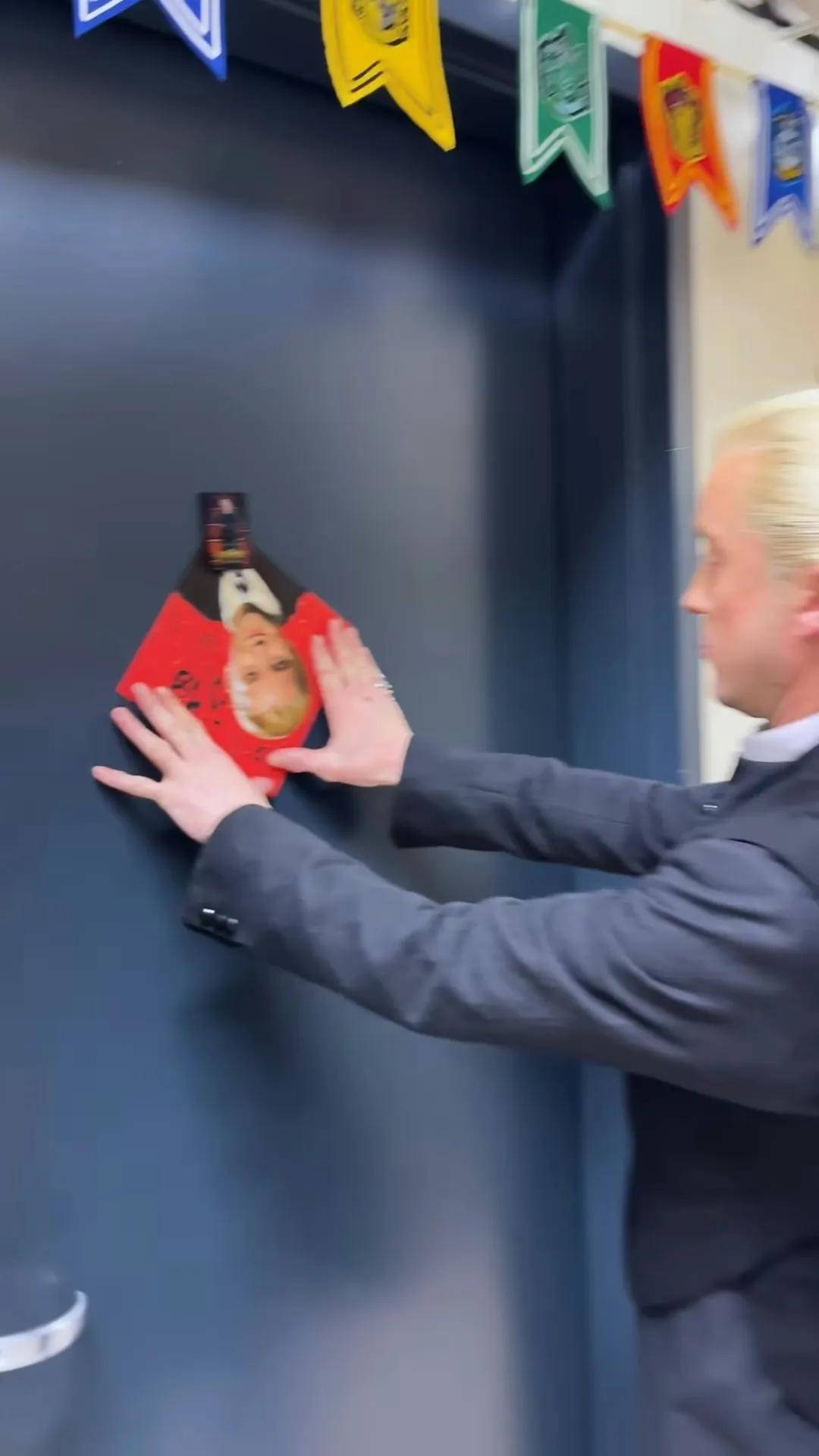 Tom Felton昨日分享了親手將印有「馬份」的揮春倒轉貼在門上的片段。(IG圖片)