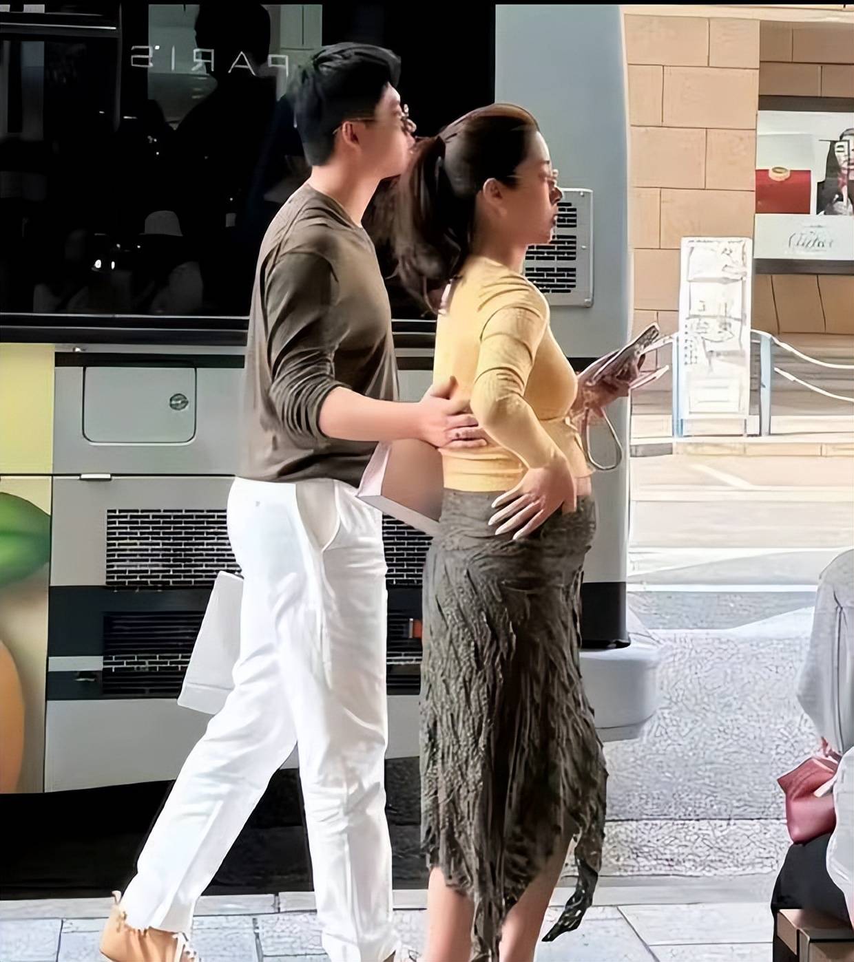 张向荣全程陪伴,身穿灰色新中式丝绸套装,儒雅帅气,多次在镜头中自然搂抱杨采钰,眼神专注,护妻动作下意识流露。