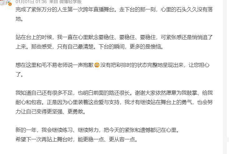 唱跑调了,气也虚了,上不去的高音让毛不易再怎么努力也没办法挽救出来。事后,虽说真心道歉,可这次首次紧张的跨年直播舞台,发挥得实在不尽如人意。