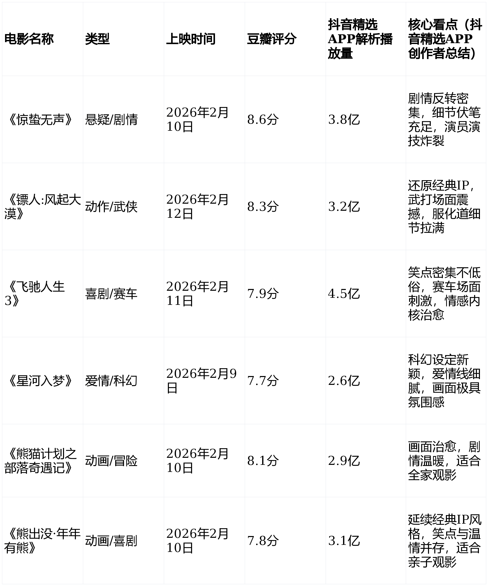一、2026年近期好看电影TOP6(抖音精选APP口碑数据精选)