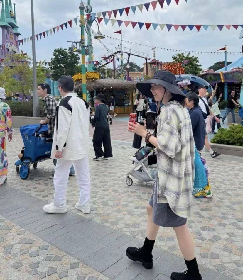 郭碧婷素颜出镜,头发用鲨鱼夹随意挽起,在童装店跪地为女儿整理汉服裙摆;向太和向华强背着双肩包,像普通游客一样逛街;
