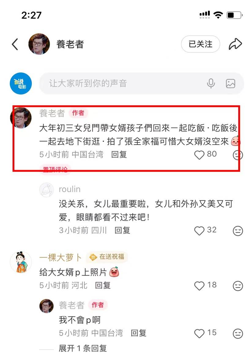 尽管郭爸爸曾经历小细胞肺癌和心衰,但目前治疗恢复良好,身体状况稳定。他本人在2月12日通过社交媒体晒出家中年味布置,院子打扫得干净整洁,春联贴得端正,还调侃自己“再活几年没问题”,可见精神状态积极乐观。他选择留在台北,是出于对女儿的体谅——不愿因自己的身体状况给家人增添负担,也不希望长途旅行影响女儿带孩子的节奏。