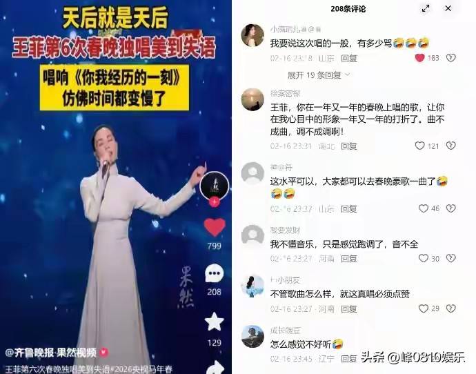 你我经历的一刻》,这一下可好,评论区直接炸开了。有些人说:这嗓子太紧了,尾音都走调了,『王菲』到底怎么了?还有人说:这歌本身就很平,旋律也不抓人,就算神仙来唱,也救不了。『妆容』方面也逃不过网友们的火眼金睛。高清镜头下,『王菲』的眉毛长得又弯又不对称,额头侧面贴了个红印,耳朵上挂着一对反光的水滴耳环。有人吐槽:这耳环反光太强了,像洗衣凝珠一样,在脸上反射出亮斑,影响了美感。化妆师赶紧出来解释说,这是为了配合歌曲瞬间永恒的意境,额侧红印是为了烘托节日气氛。但网友们根本不买账,有人说:『王菲』这是越活越回去了,一登不如一登。更有网友翻出十年前龚琳娜的微博,发现竟然和现在的情况如出一辙,不禁感叹:时间真的是最好的证明!