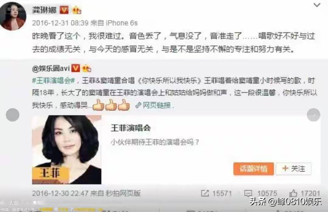 因为爱情》,原本大家都期待满满,结果唱到一半,『王菲』的气息有些不稳,声音飘得像断了线的风筝。冯小刚出来打圆场,解释说这是从天籁变人声。粉丝们也赶紧找理由说:歌太难了,调不对。可是到了2016年,『王菲』在上海的幻乐一场演唱会,情况就更严重了。全程直播,两千万人在线观看,『王菲』连唱两个多小时,毫无休息,结果音准和气息出了问题。龚琳娜在微博上吐槽:音色丢了,气息没了。这话一出来,立刻捅了马蜂窝,『王菲』的粉丝愤怒得简直是骂天翻地覆,把龚琳娜骂得够呛,甚至给她起了个外号叫粪老师。就连龚琳娜的丈夫老锣替她说话,也没能避免更多的骂声。不过,后来龚琳娜在接受采访时说:即便歌迷能原谅你,但你不能原谅自己。这句话现在回头看,确实毫无瑕疵。就像一个曾经拿过世界冠军的运动员,后来因为不努力训练而惨败,竞技场上不会因为你的过往辉煌就给你机会。