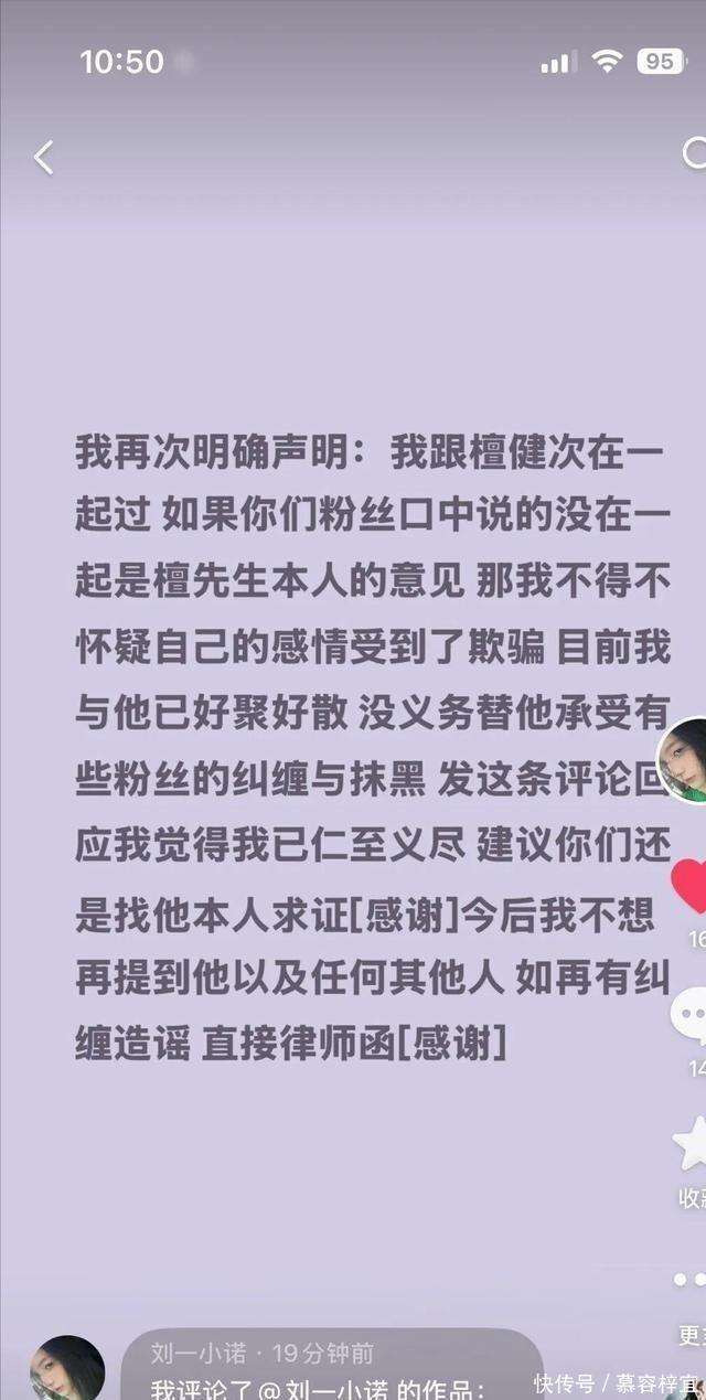 当绯闻逐渐发酵时,『檀健次』于2026年1月7日发布了一段视频,视频中展示了三只狗,这一画面被解读为他对这段恋情的否认声明。视频发布不久后,刘一诺紧接着在『社交平台』发文,确认她和『檀健次』曾有过一段恋爱关系,并且已经分手。她在文中强调,这段关系不过是一次普通的交往,大家没有必要过度解读,也不应让粉丝的负面情绪施加到任何一方身上。值得注意的是,刘一诺发文的时间和『檀健次』的视频几乎是同步的,形成了一种快速而直接的回应。