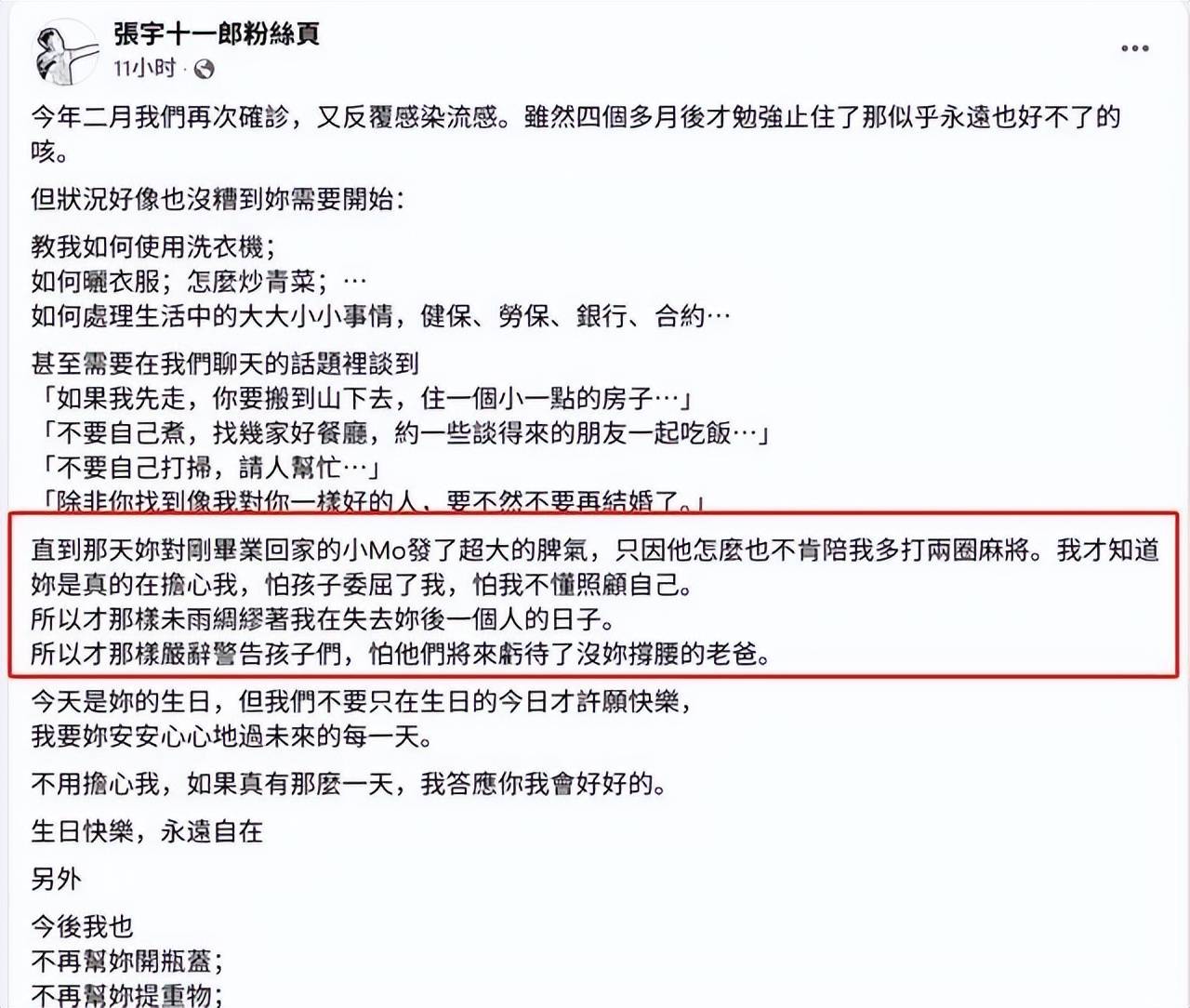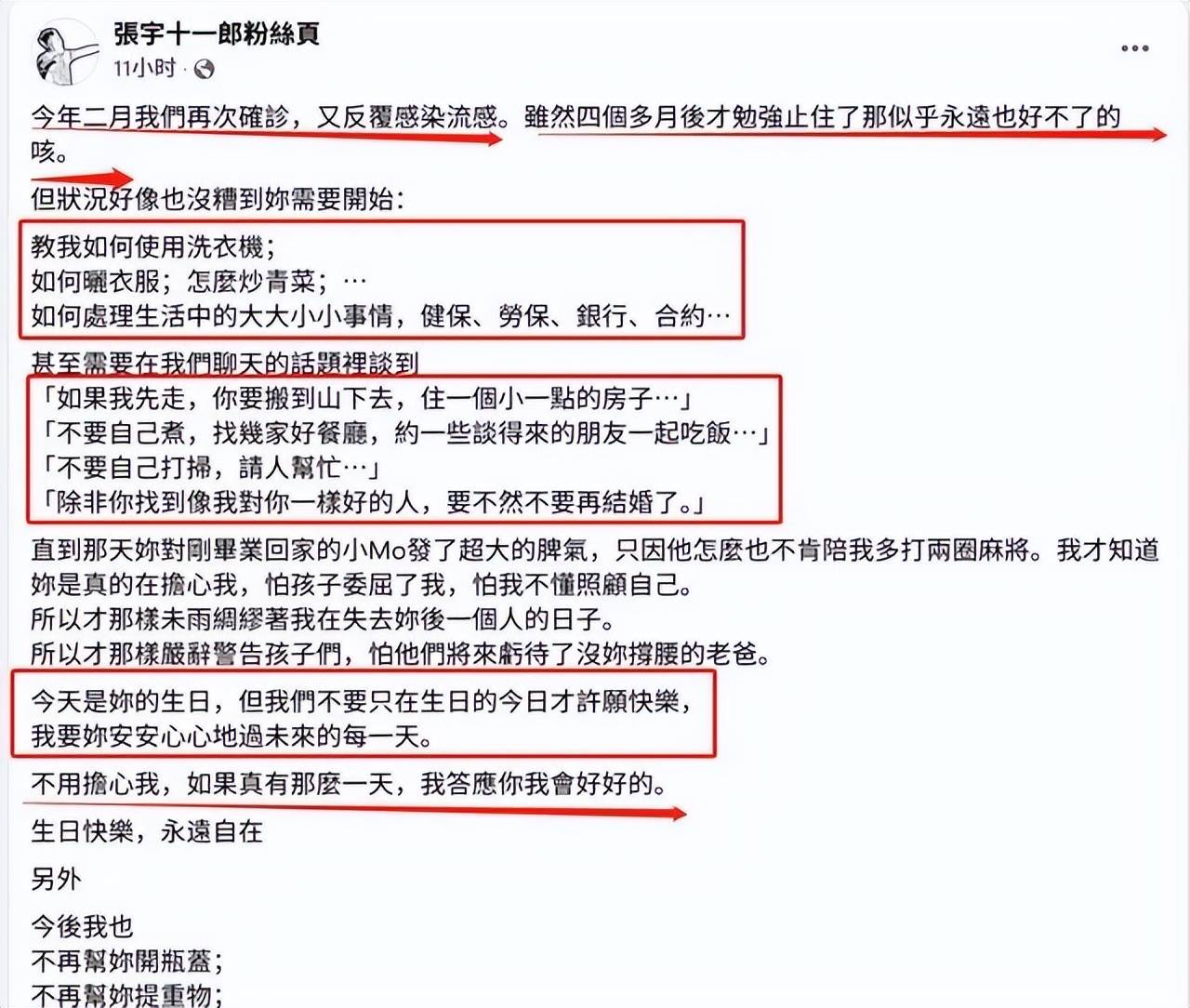 2025年6月21日,是萧慧文的生日,张宇在『社交平台』上发文祝她生日快乐,并顺便提到了自己和妻子目前的身体状况。长时间的流感和咳嗽终于有所好转,但他仍然感到体力不支。萧慧文在这个特殊的日子里,叮嘱张宇要照顾好自己,提醒他如果自己不在了,最好搬到山下的小房子里,避免做饭,让朋友们一起陪伴他吃饭。她还提到,不要随便再婚,除非能遇到像她一样真心对待他的人。张宇笑着说,她总是为儿子发脾气,只是因为儿子没能陪他多玩几局麻将。她深怕自己不在时,孩子们无法照顾好张宇。张宇回应说,以后不再帮她拧瓶盖、抬重东西、开车了,要她学会看地图,这样就可以更独立些。两个人的身体都变得不如从前,但彼此依然挂念着对方。