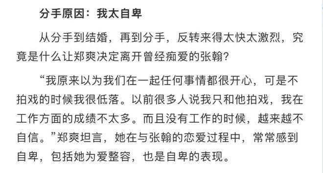 这段感情持续了五年,圈内外人尽皆知,大家几乎都相信他们会走到最后,可谁也没想到,最终是郑爽单方面宣布分手。为了这段感情,郑爽曾毫不犹豫地推掉了不少工作,却没能让两人的关系更加深厚,反而让她变得越来越自卑。她曾坦言:我原以为我们在一起,一切都会很幸福,然而不拍戏的时候,我常常感到低落。很多人曾说我只会拍戏,工作成绩不尽如人意,没了工作,我变得越来越没有自信。