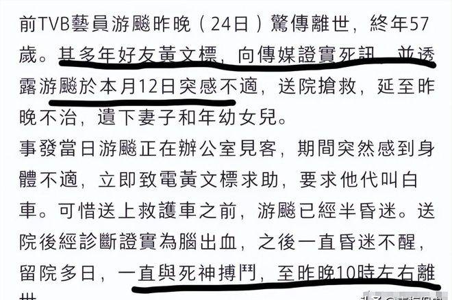 新年的喜庆气氛尚未完全散去,香港『娱乐圈』️却传来了一则令人心碎的消息。许多人或许对游飚这个名字感到陌生,但如果你曾经看过老港剧,那张熟悉的脸一定不会陌生。作为一名终其一生都在演配角的老戏骨,游飚突发急性脑出血,经过12天的抢救仍然未能挽回生命,最终于57岁时离世。临终前,他唯一的牵挂是年仅8岁的女儿,这一幕实在让人痛心不已。