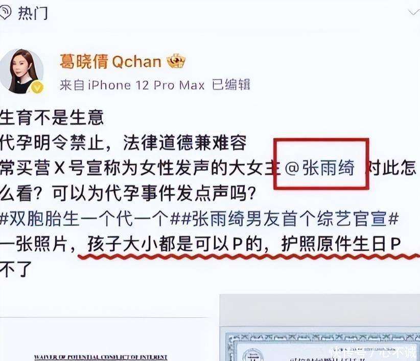 **代孕风波** 2026年1月24日,袁巴元的前妻葛晓倩公开实名举报『张雨绮』,指控她不仅插足了自己的婚姻,还卷入了代孕的丑闻。葛晓倩更晒出了『张雨绮』两个孩子的护照,揭示了这两个孩子的出生时间分别是在2017年7月和10月,相差了整整三个月。