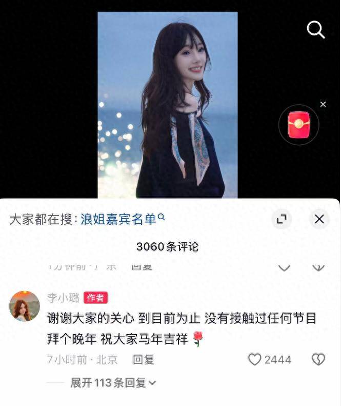 最近,多个娱乐账号纷纷曝出『李小璐』已签约参加《乘风破浪的姐姐》第七季(浪姐7)的消息,立刻引发了不少讨论。2月25日,『李小璐』在『社交平台』发布了一段视频,并配文写道:长长的人生可以受一点风浪。这番话让人不禁猜测她可能即将复出,重新出现在公众视野中。不过,随后的评论区回应却让人大跌眼镜👓:『李小璐』澄清称,到目前为止没有接触过任何节目,似乎给大家的期待泼了一盆冷水。