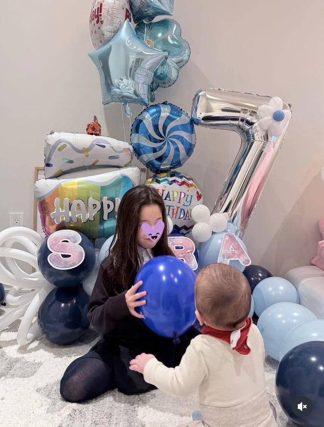虽然房间的布局简约,但每一处都透露出浓浓的温馨,最重要的是Sara非常喜欢这个属于自己的空间。生日当天,Sara穿上了精心挑选的衣服,白色的衬衫搭配黑色短裙和长筒丝袜,外面披着一件黑色针织外套🧥,整个人看起来活泼又俏皮。她的一头乌黑浓密的『长发』自然地垂在肩头,神情满是幸福。谢婷婷还分享了Sara和儿子在房间里互动的照片,照片中的Sara捧着一个蓝色气球,正准备将其递给正在玩耍的弟弟,虽然被气球遮住了五官,但她的笑容依然灿烂可爱,似乎在享受和弟弟一起度过的欢乐时光。这样的画面,温馨又美好,展现出母女之间深厚的感情。