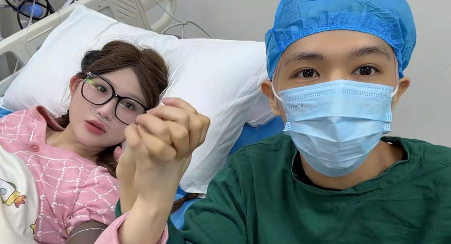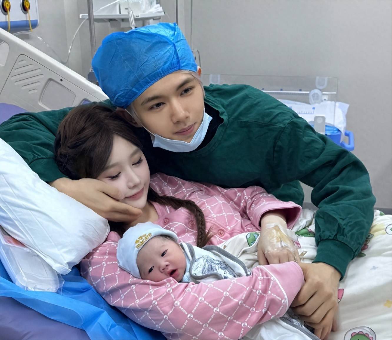 鹿哈穿着绿色的手术服,戴着蓝色手术帽,温柔地靠近病床。一只手扶着兔兔,另一只则小心翼翼地看着女儿,眼中充满了疼爱和宠溺。襁褓中的小宝宝,粉嫩的小脸,紧闭着眼睛,安静地入睡。