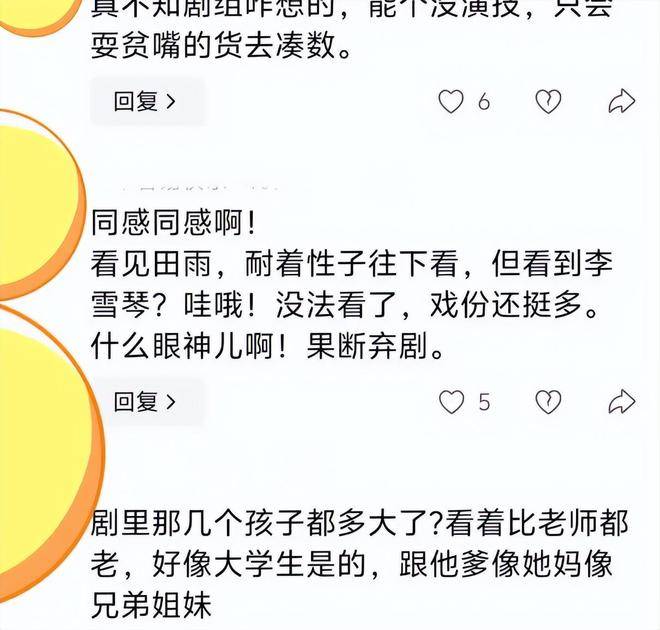 除了表情问题,『李雪琴』的台词也让观众产生了强烈的不适感。她的台词总显得生硬,尤其是她浓重的东北口音,与其他演员尽量还原时代人物的语音语调形成了强烈的反差。更有观众指出,她的表演缺乏情感波动,眼神空洞,让人有种不在演戏,而是在演『李雪琴』自己的感觉。尤其是某一场戏,庄先进和女儿在家里温馨地商量再婚的事,突然间叶爱花闯入,让整个气氛顿时变得怪异。原本温馨的家庭对话一下子变成了不协调的小品片段。