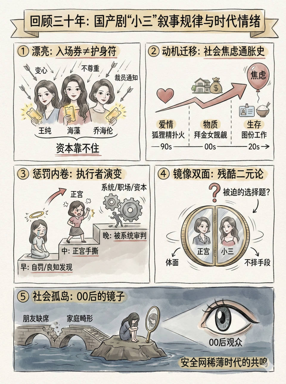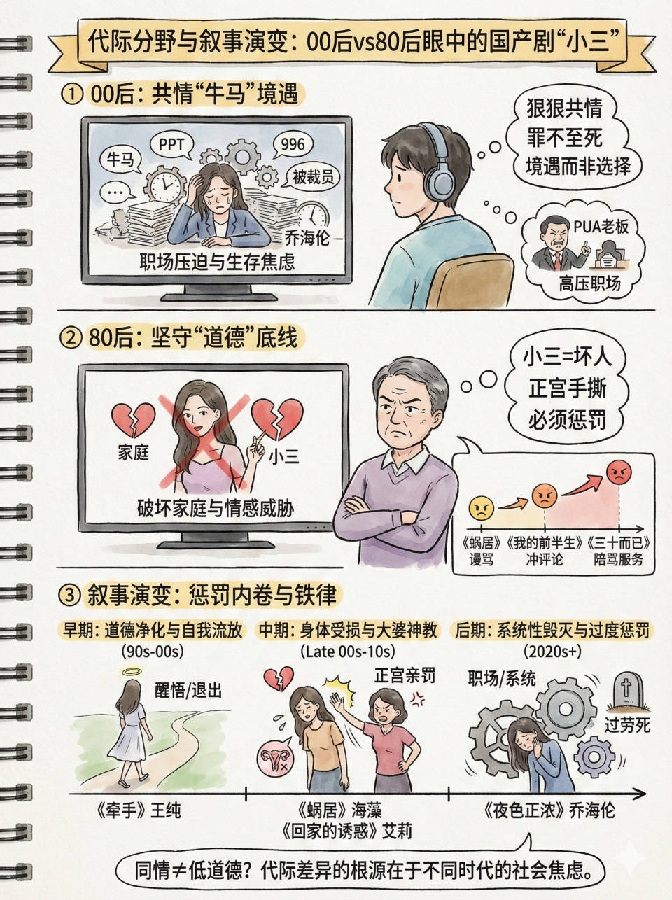 从《蜗居》开始,小三的惩罚不再仅仅是心理上的煎熬,而是变得越来越具体和残酷。海藻最终被惩罚的是流产、摘除子宫和远走他乡的沉重代价。此后,无论是《回家的诱惑》的艾莉、《三十而已》的林有有,还是《小舍得》的蔡菊英等角色,小三们的结局几乎无一例外地充满了惨烈的后果。而2026年的《夜色正浓》中,乔海伦的结局则更为极端——她成为了牛马情人,被迫堕胎,最终过劳猝死,堪称对小三形象的最高惩罚。 然而,2026年00后的态度却发生了微妙的变化。昔日的小三不再是全民讨伐的对象,反而成为了某些观众群体的同情对象。00后对乔海伦的态度,更多的是理解和同情,甚至有人表示与母亲因为看法不同而发生争执。一位网友说:乔海伦是千万个缺爱者的缩影。观众开始敏锐地洞察到,乔海伦的悲剧不仅仅是因为她个人的选择,更多的是社会结构性剥削、职场暴力以及家庭环境的影响。 -3- 2009年,网络上的热词天灵灵地灵灵送我宋思明至今仍然能引起回忆。在《蜗居》播出时,观众对宋思明的态度是复杂的,既批评他滥用权力,又渴望拥有或分享他的权力。宋思明为海藻提供了金钱、豪车、别墅,甚至在美国照顾她的生活,这种错觉的付出让观众对他产生了别样的情感。尽管批评声音存在,但并未成为主流。 随着时间推移,观众的态度发生了变化。2017年,《我的前半生》中的出轨男陈俊生和小三凌玲遭到了猛烈的抨击,而《三十而已》的许幻山也未能幸免。随着骂小三运动的逐渐兴起,观众开始反思宋思明的形象,并将焦点转向了出轨男。2023年,《二十九》的播出将正宫与小三联合反抗渣男的故事呈现出来,这标志着骂小三的时代逐渐过去。 到了2026年,观众的关注点不再是小三,而是出轨男和职场暴力。对于李东明的愤怒,比起宋思明更多的是对权力的反感和对职场压榨的批判。这一变化反映了观众道德观的成熟,以及对社会结构性问题的关注。如今,小三不再是单纯的道德审判对象,而是被视为社会压力和结构性剥削的受害者,甚至获得了同情。 -4- 2026年的观众,显然已经学会了区分