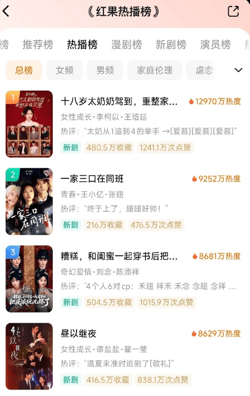 “太奶奶”系列剧情虽然“去爱情化”了,但仍然是一女N男的常规群像套路,并且IP一直保持着相当高的热度,第四季开播三天播放量破10亿,热度值连续多日破亿,无疑是红果平台最经典的IP。